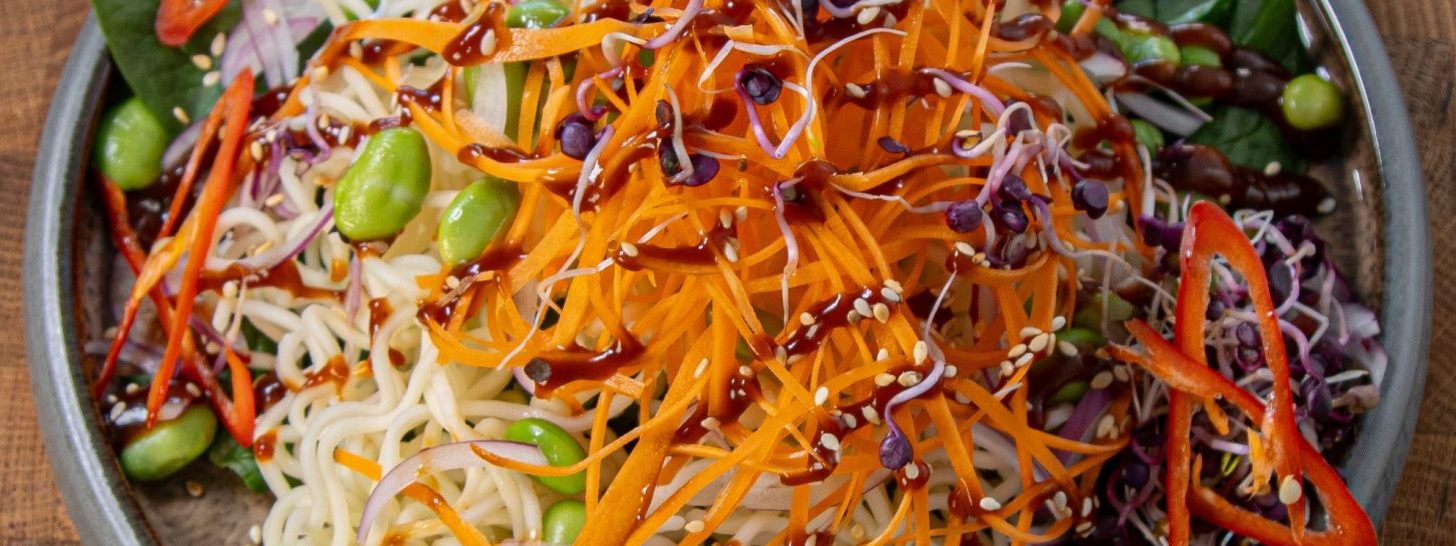 2. Zubereitung: Alles in einer Schüssel wie folgt anrichten. Babyspinat – Mienudeln – Karottenstreifen – Rote Zwiebeln – Mukimame – Sprossen – Saucen Liebe Korean BBQ Style